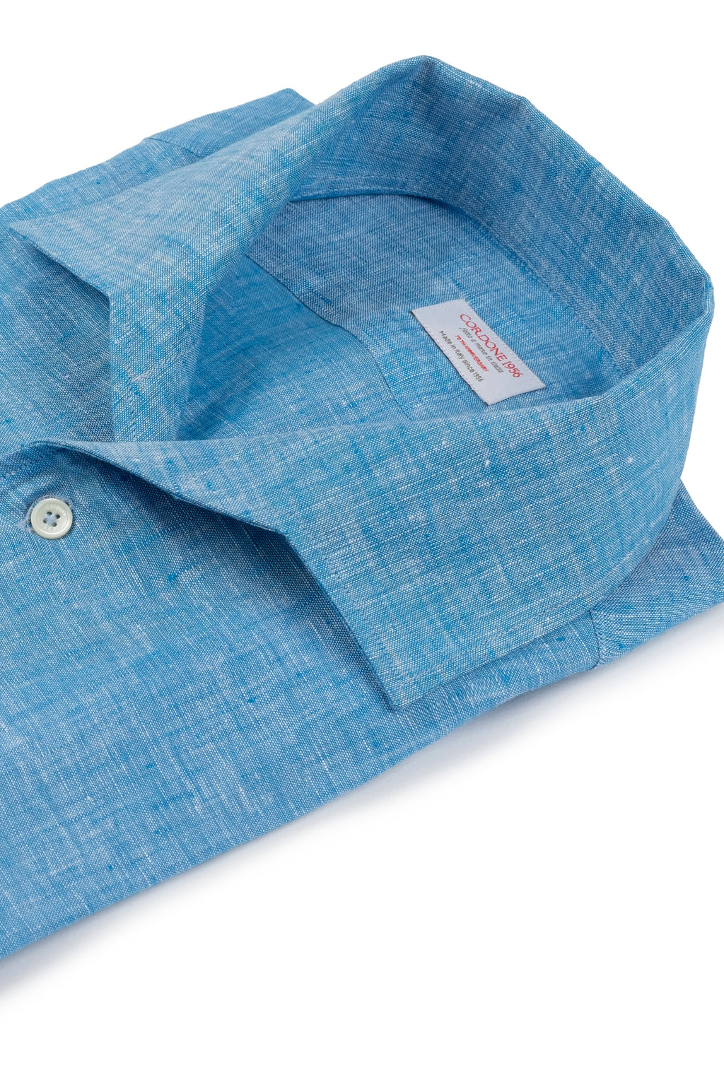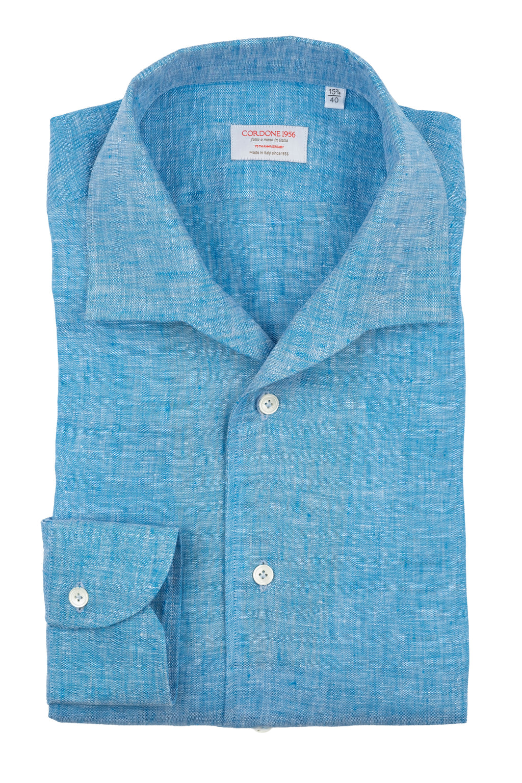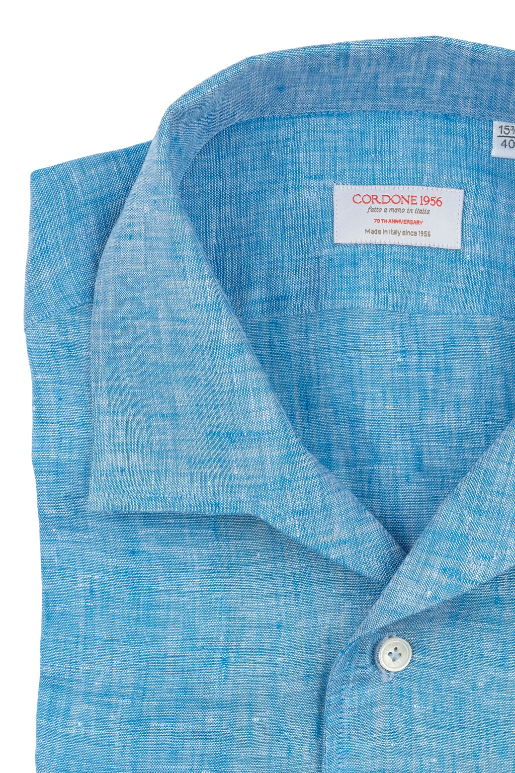 La Camicia Capri Lino Turchese Scura  è una camicia in lino, realizzata a mano in Italia, con vestibilità sartoriale, maniche a giro e impreziosita da un esclusivo bottone in madreperla Cordone1956 e asole rifinite a mano.