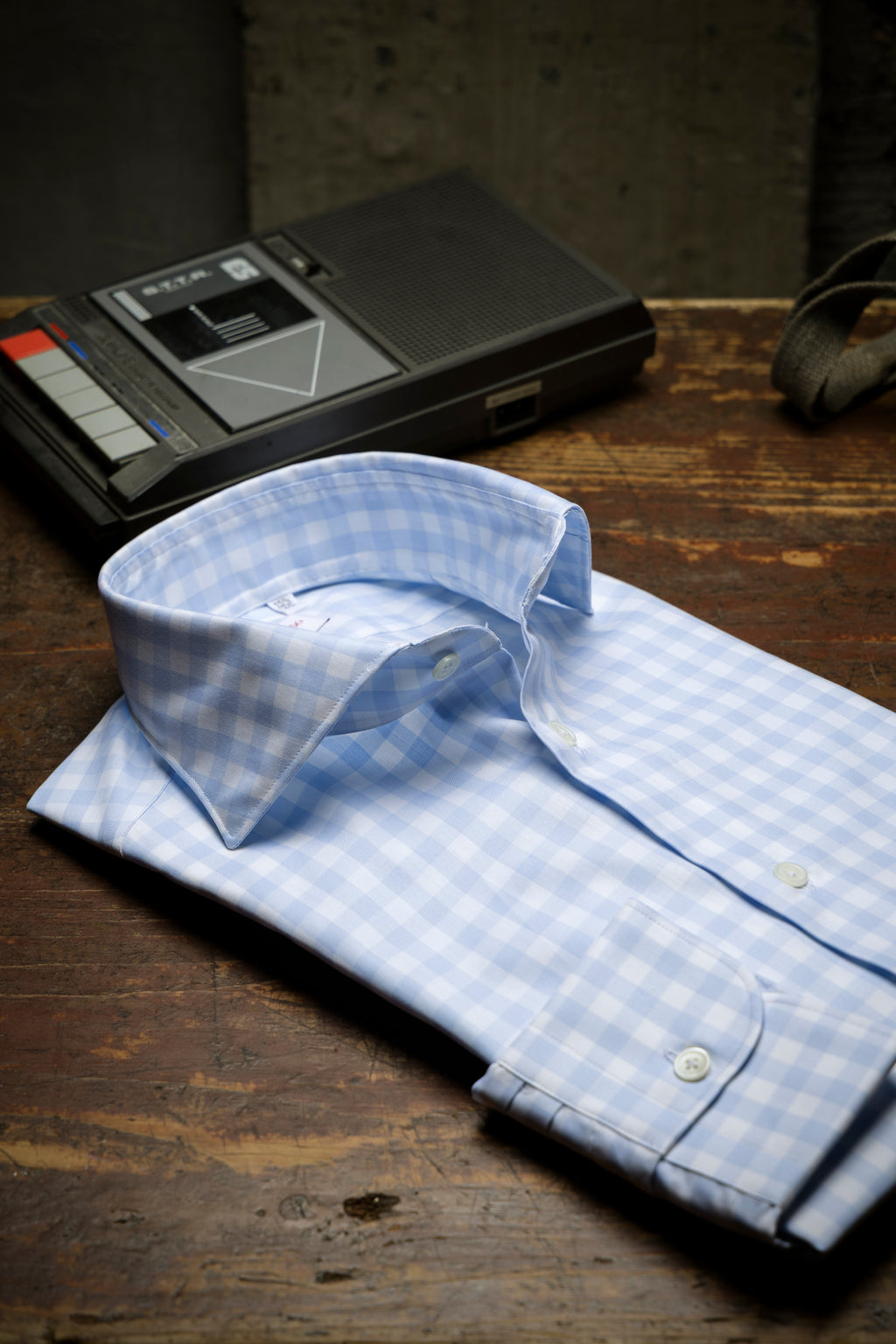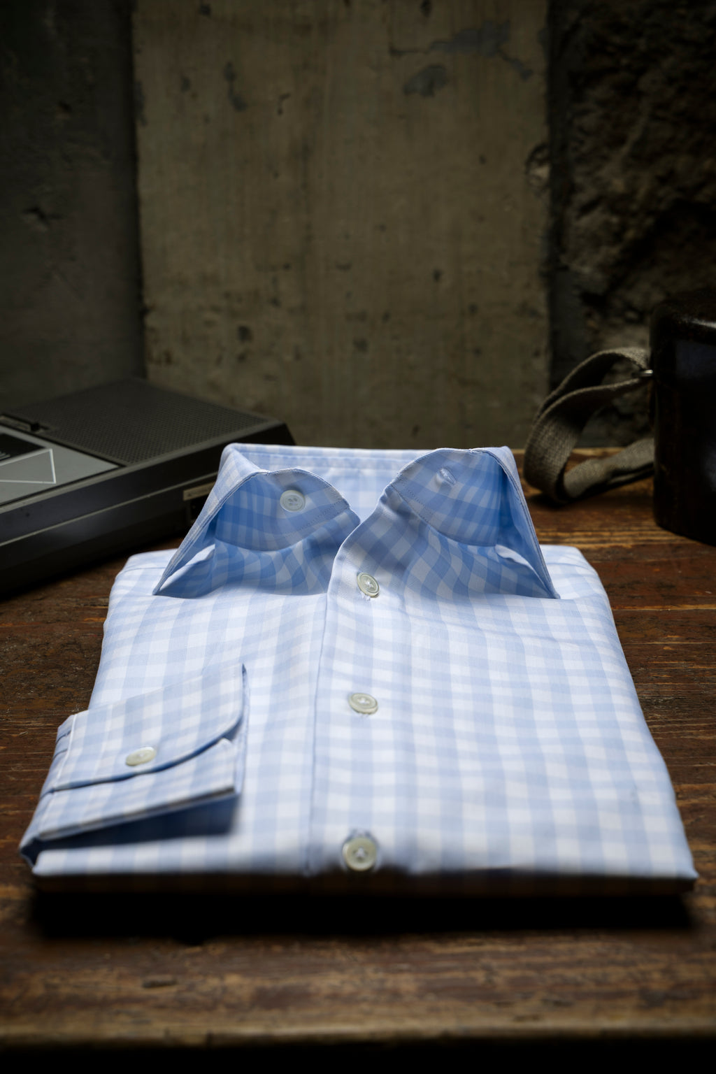 Check Twill Shirt Azure is a shirt in double twisted twill 120/2 , handcrafted in Italy, with the tailored pattern of the shifted sleeve and enriched with mother-of-pearl button and handmade buttonhole trim.