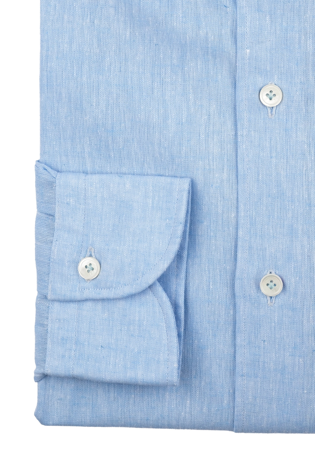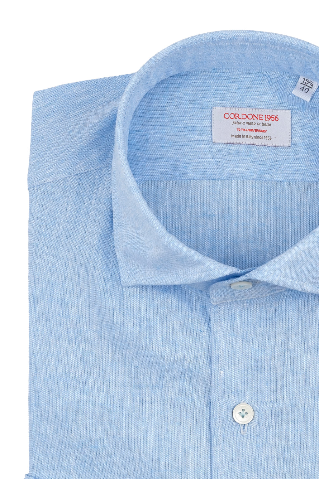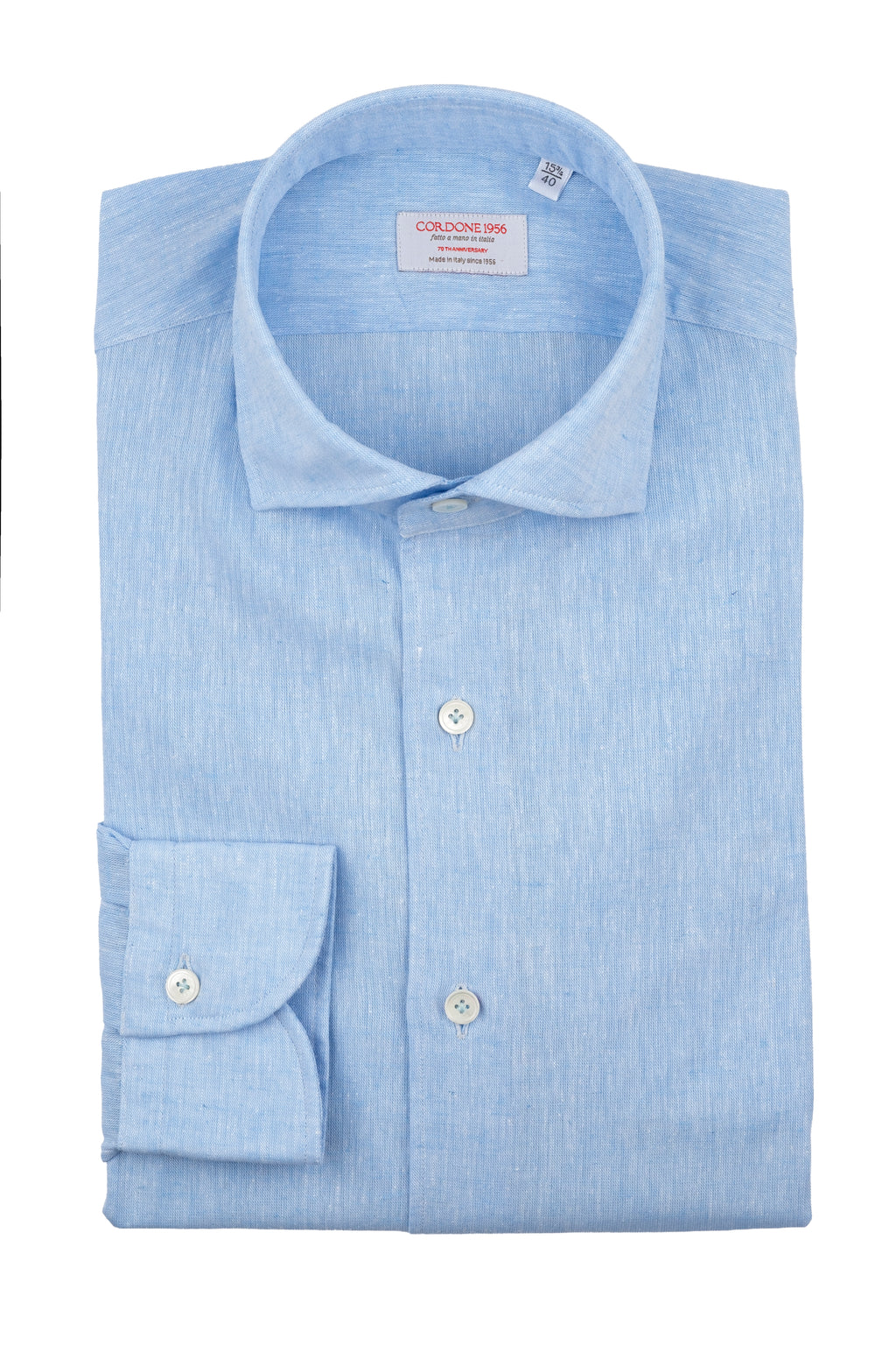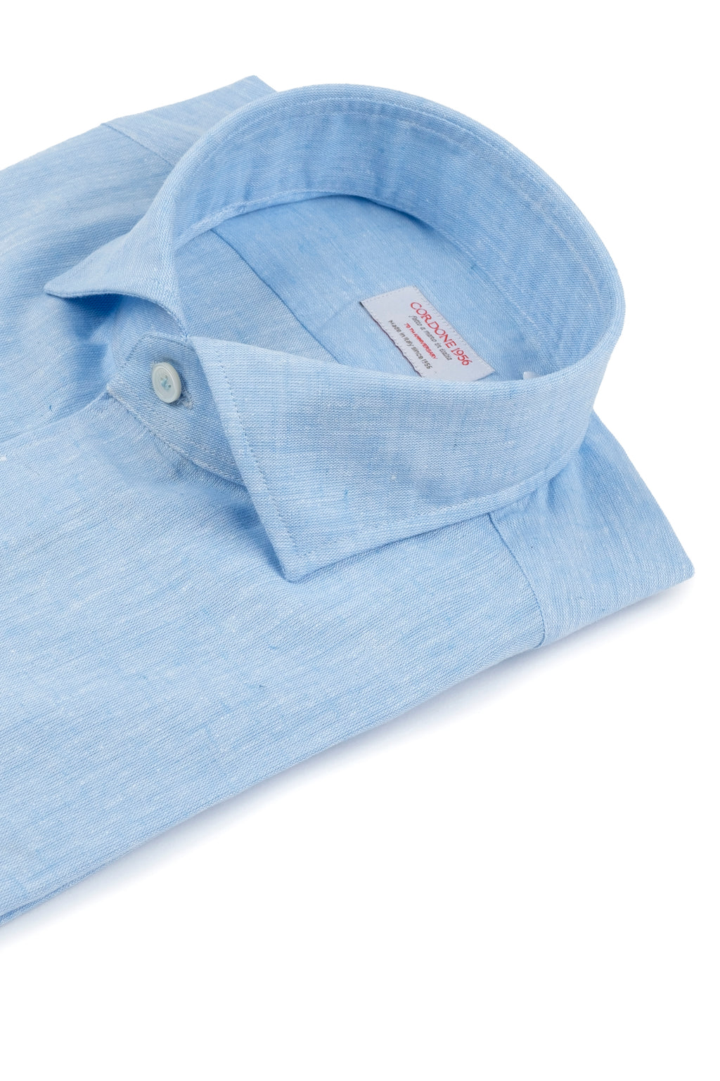 The Azure Cotton Linen Shirt  is a linen blend shirt, handmade in Italy, with a tailored fit, offset sleeves and embellished with an exclusive Cordone1956 mother-of-pearl button and hand-finished buttonholes.