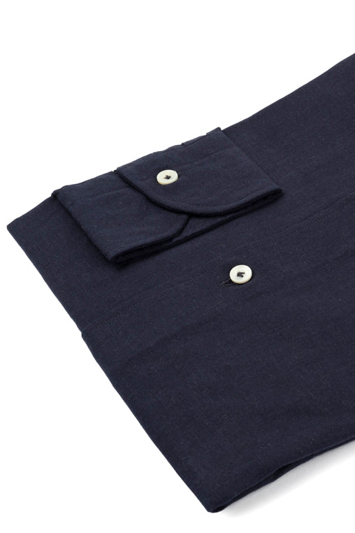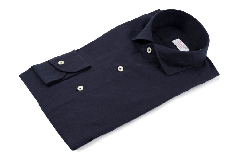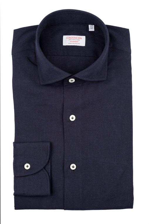 The Blue Cotton Linen Shirt  is a linen blend shirt, handmade in Italy, with a tailored fit, offset sleeves and embellished with an exclusive Cordone1956 mother-of-pearl button and hand-finished buttonholes.