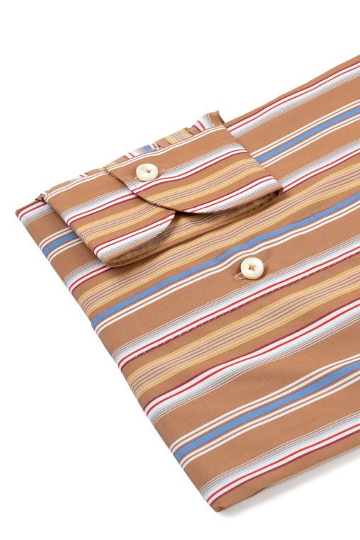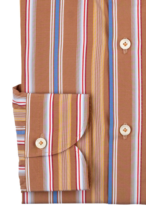 Bold Multi Striped Brown Poplin Shirt Handmade is a shirt in double twisted light Popeline 120/2 with a silky hand, hand-crafted with 5 steps and a shirt shoulder the mother-of-pearl button enriches the product.