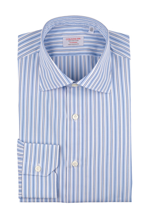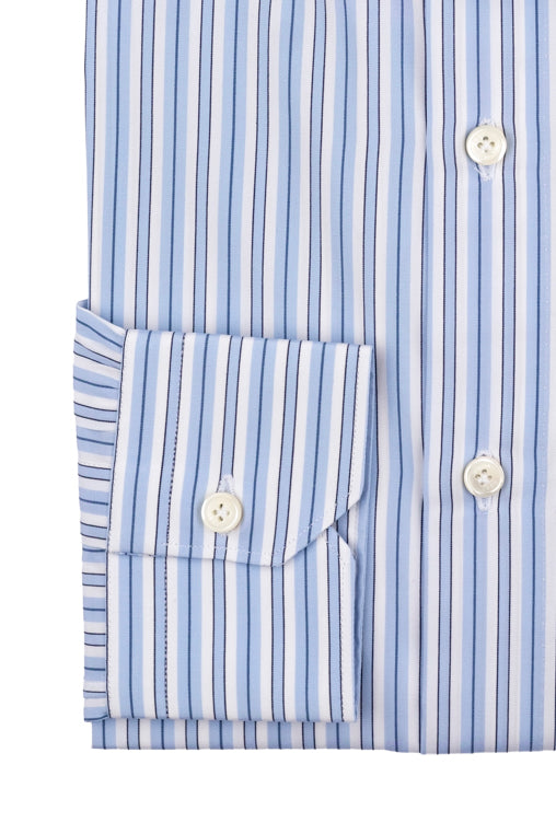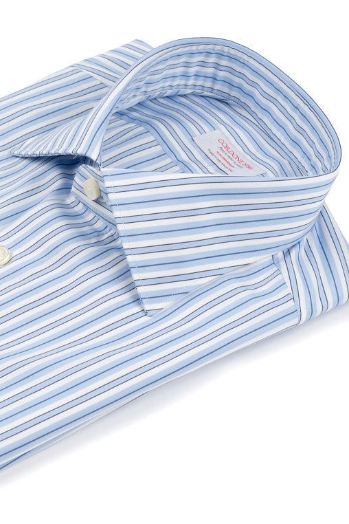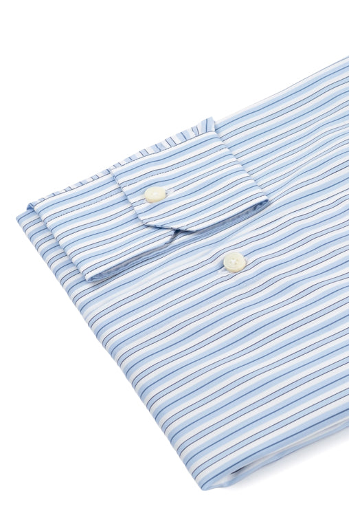Bold Multi Striped Poplin Shirt Light Azure Handmade is a shirt in double twisted light Popeline 120/2 with a silky hand, hand-crafted with 5 steps and a shirt shoulder the mother-of-pearl button enriches the product.