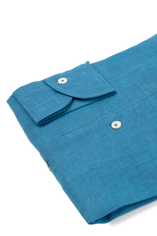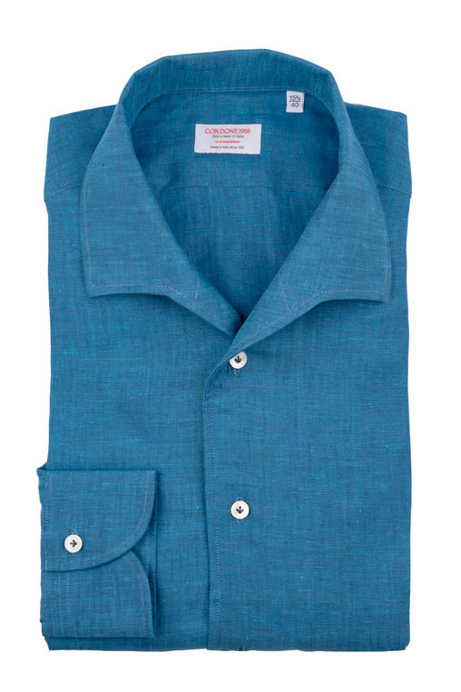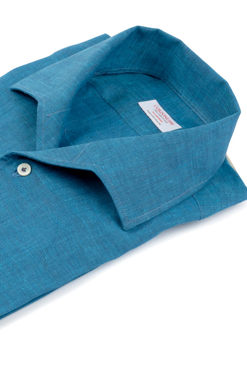 Green Water  Linen Capri Shirt is a linen shirt, handmade in Italy, with a tailored fit, offset sleeves and embellished with an exclusive Cordone1956 mother-of-pearl button and hand-finished buttonholes.