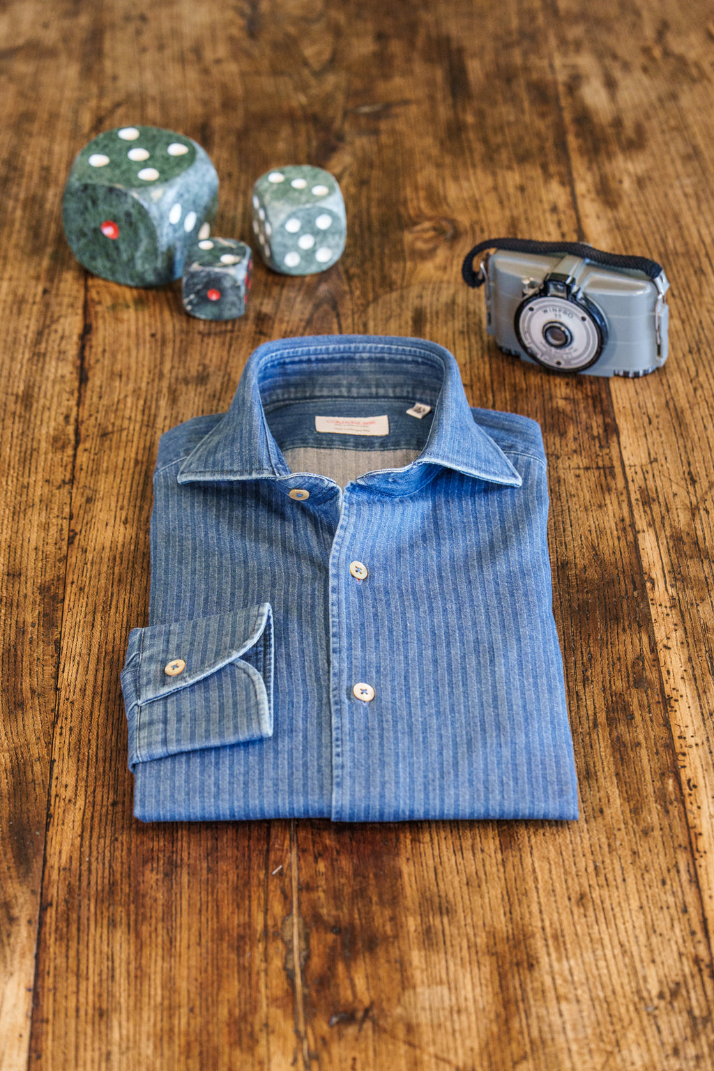 Embossed Denim Blue Shirt is one of our most popular and versatile shirts. A wardrobe essential, made from Italian denim, garment washed for a softer fabric and featuring seam effects. A versatile and timeless shirt, suitable for any business or casual look  constructed with shifted sleeve pattern with mother-of-pearl button and hand-finished buttonhole.