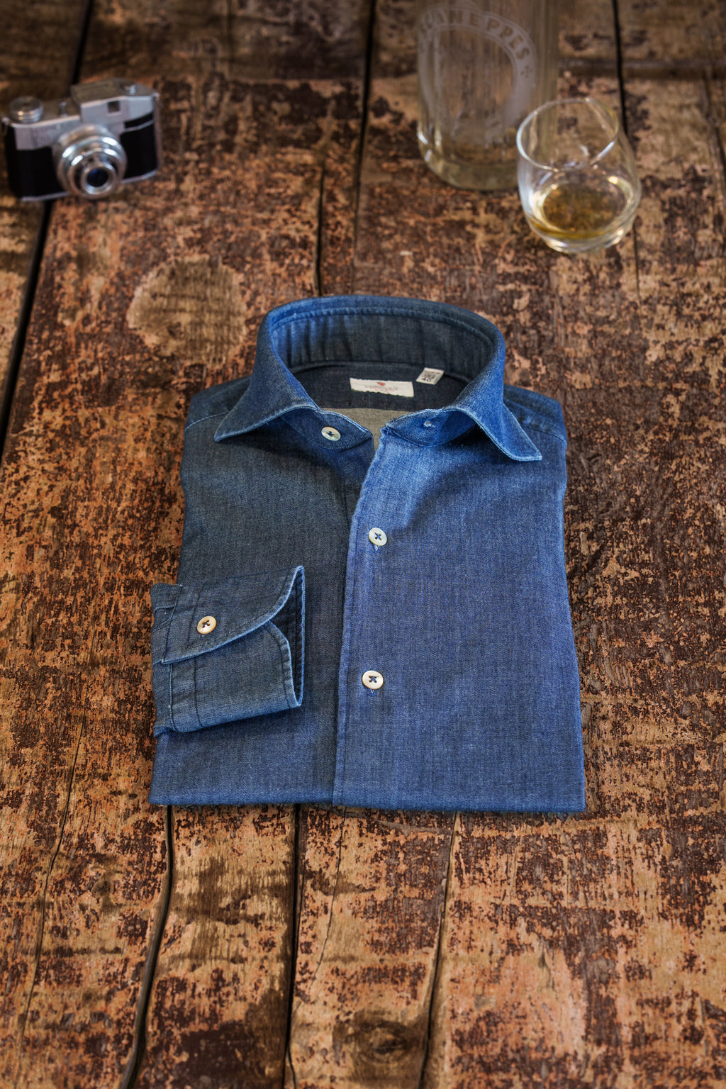 Light Blue Denim Shirt is one of our most popular and versatile shirts. A wardrobe essential, made from Italian denim, garment washed for a softer fabric and featuring seam effects. A versatile and timeless shirt, suitable for any business or casual look  constructed with shifted sleeve pattern with mother-of-pearl button and hand-finished buttonhole.