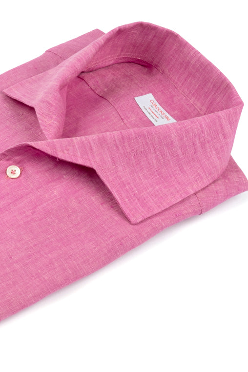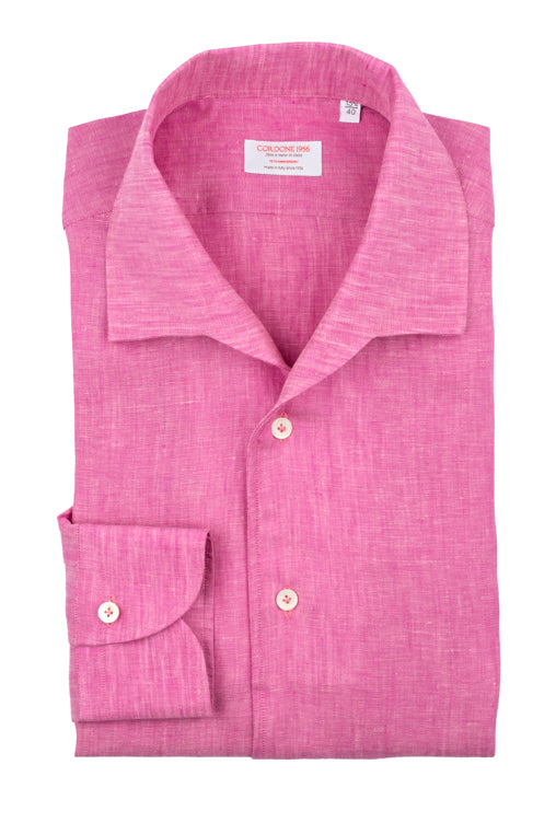 Pink Linen Capri Shirt is a linen shirt, handmade in Italy, with a tailored fit, offset sleeves and embellished with an exclusive Cordone1956 mother-of-pearl button and hand-finished buttonholes.