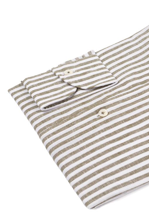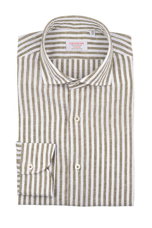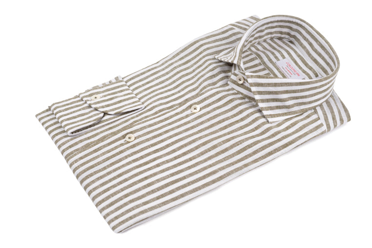 Striped Cotton Linen Shirt Green is a linen blend shirt, handmade in Italy, with a tailored fit, offset sleeves and embellished with an exclusive Cordone1956 mother-of-pearl button and hand-finished buttonholes.