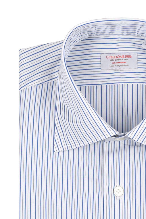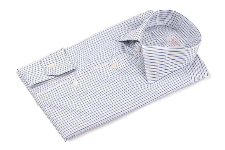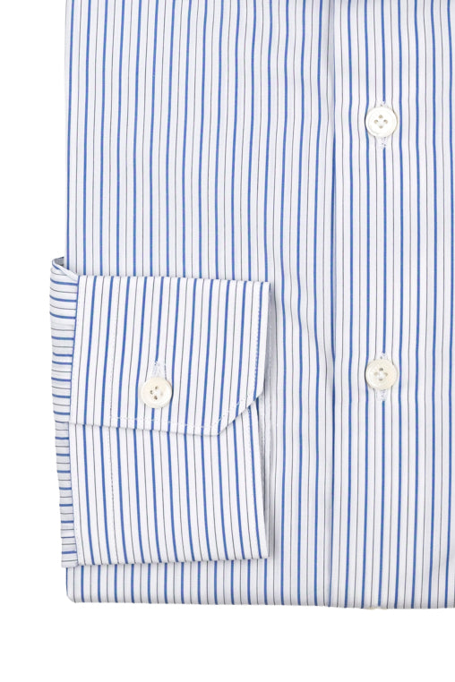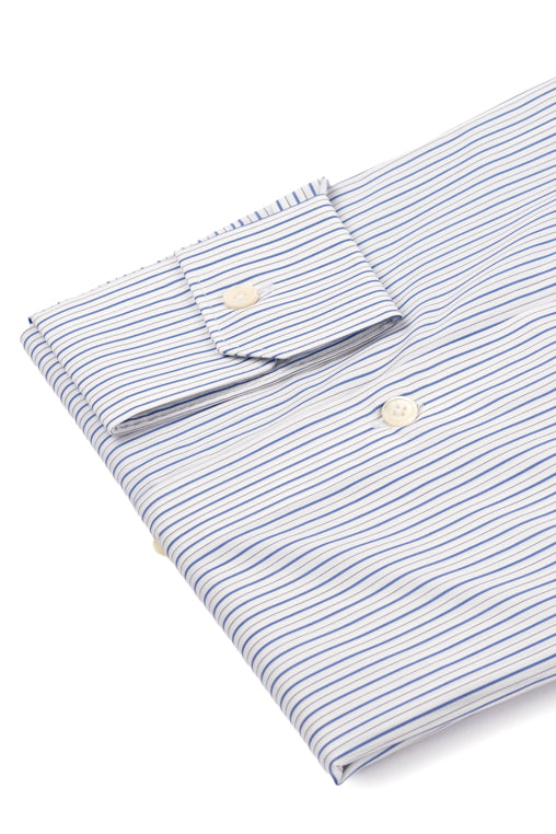 Striped Popeline Shirt Blue And White a shirt in double twisted popeline 120/2 , handcrafted in Italy, with the tailored pattern of the shifted sleeve and enriched with mother-of-pearl button and handmade buttonhole trim.