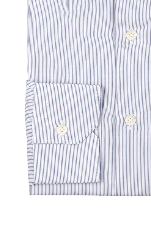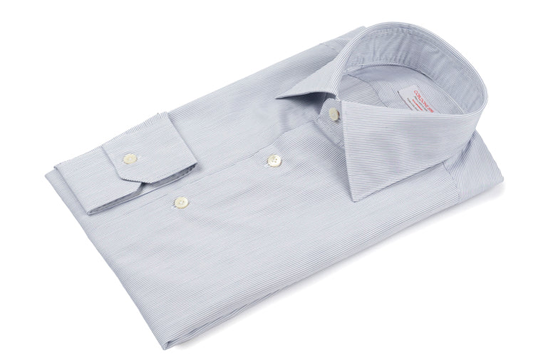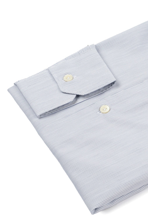 Striped Shirt In Fine Blue Poplin is a shirt in double twisted popeline 120/2 , handcrafted in Italy, with the tailored pattern of the shifted sleeve and enriched with mother-of-pearl button and handmade buttonhole trim.