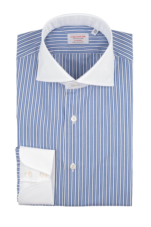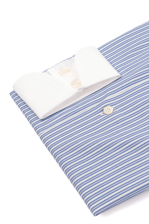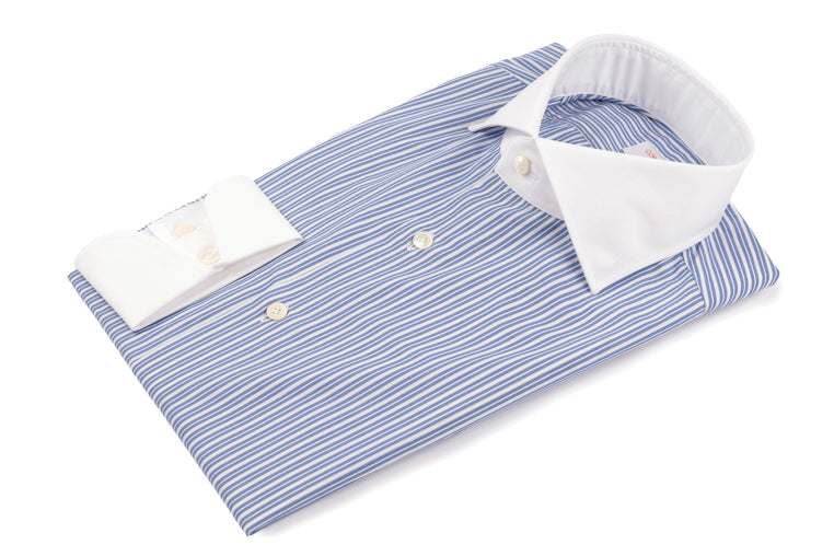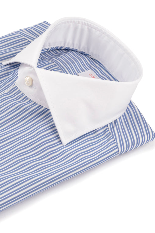 White Collar Striped Popline Shirt is a shirt in double twisted twill 120/2 , handcrafted in Italy, with the tailored pattern of the shifted sleeve and enriched with mother-of-pearl button and handmade buttonhole trim.